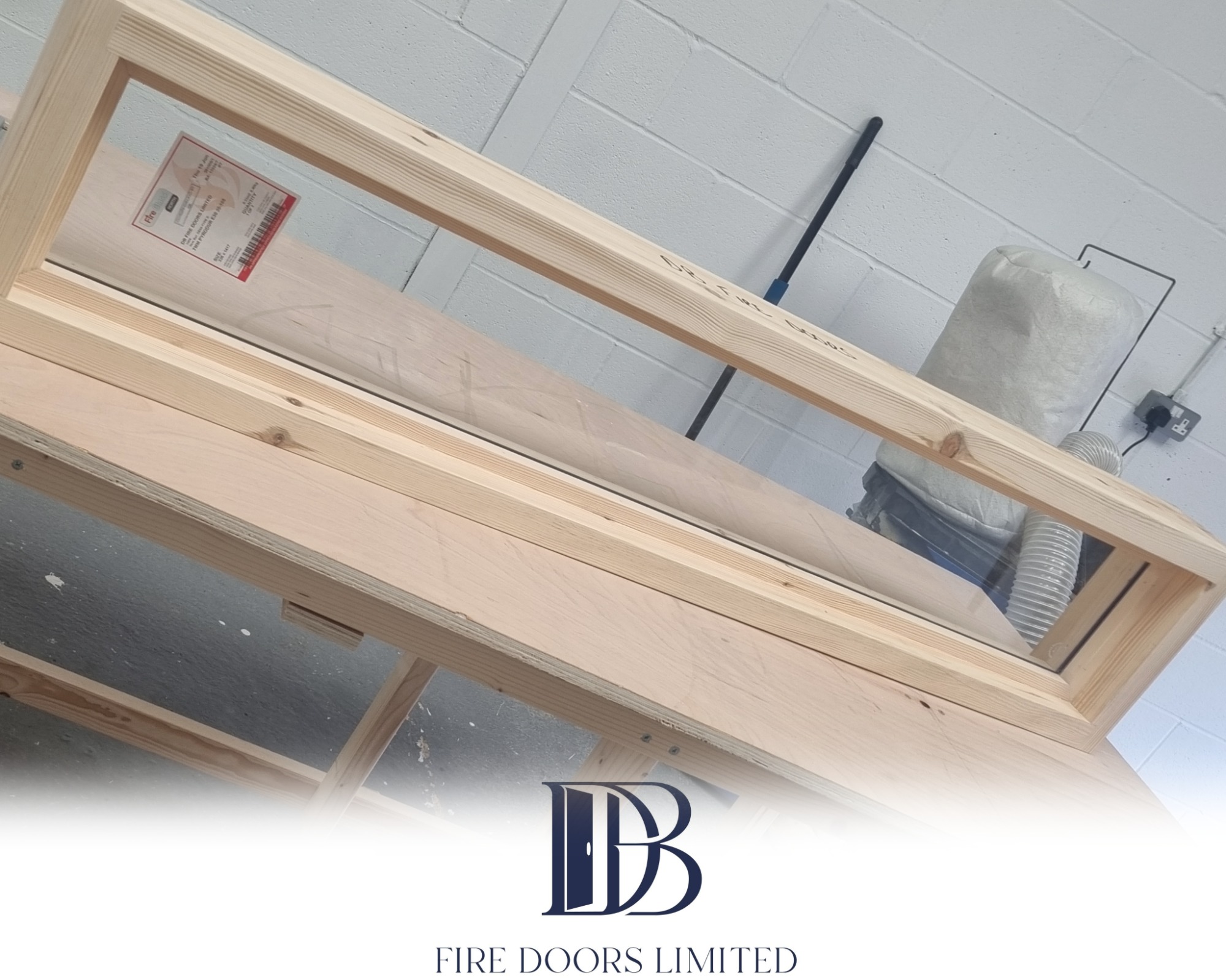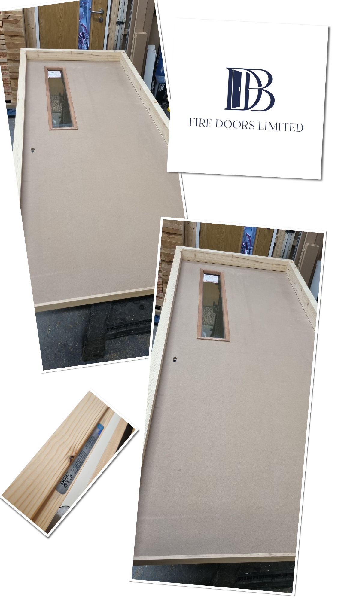 Fire door manufacturing process, showing a large raw FD30 fire door blank with a cut vision panel and a certification label
