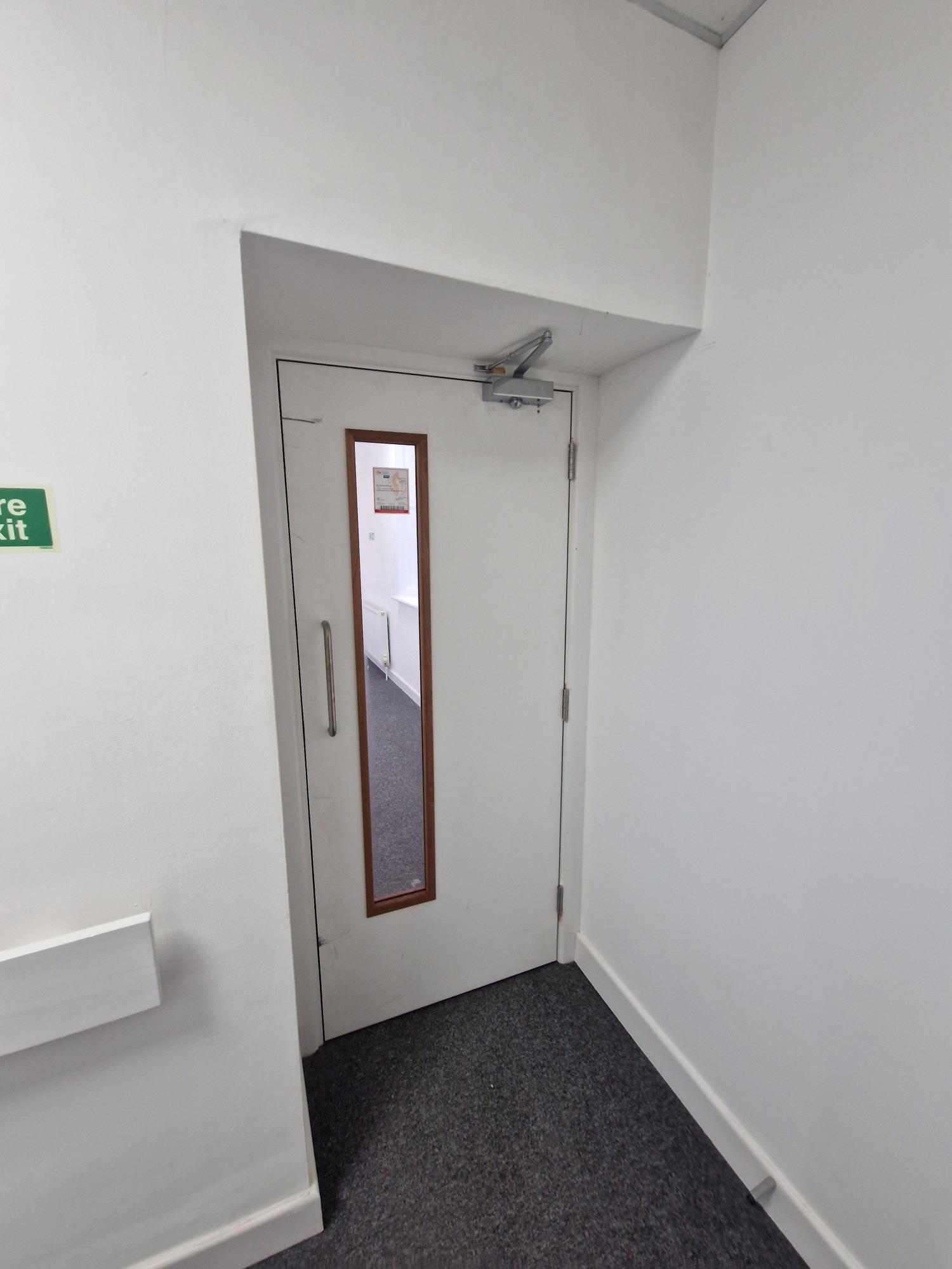 White paint grade FD30 fire door with vision panel and silver door closer in a modern office hallway.