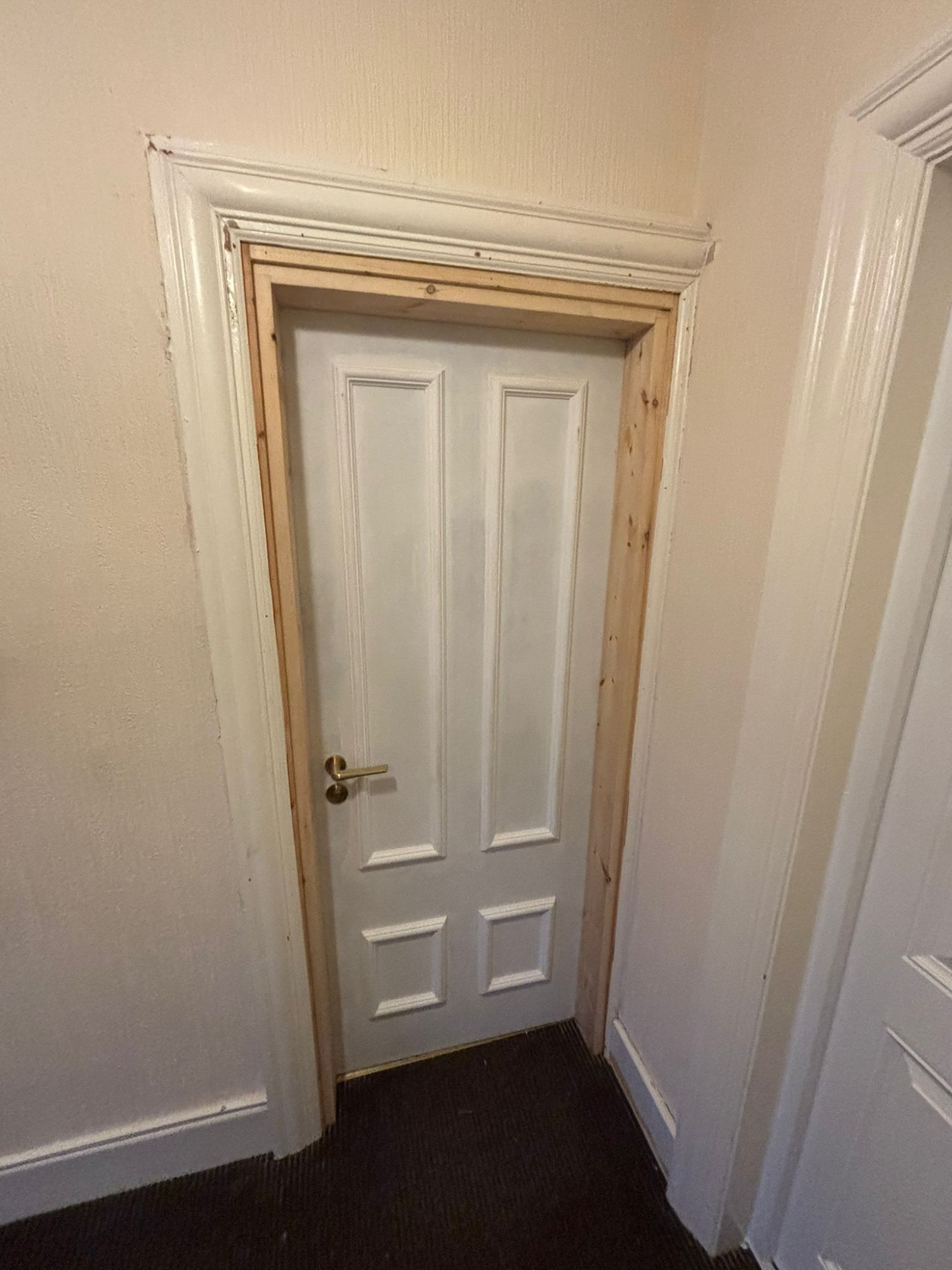 White four-panel door featuring face-fixed beading detail, professionally fitted into a new timber door frame.