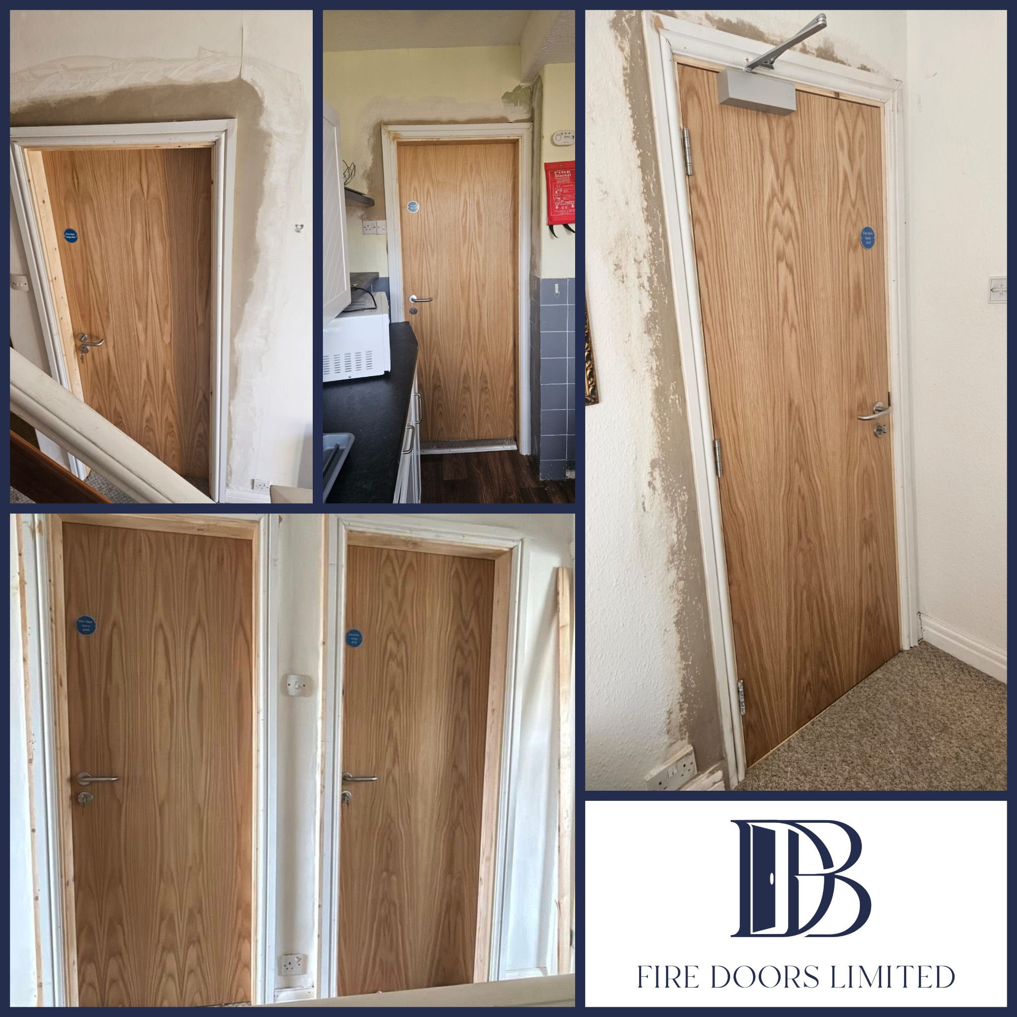 Collage showing multiple installed oak veneer fire doors with compliant ironmongery and overhead closers in a residential property.