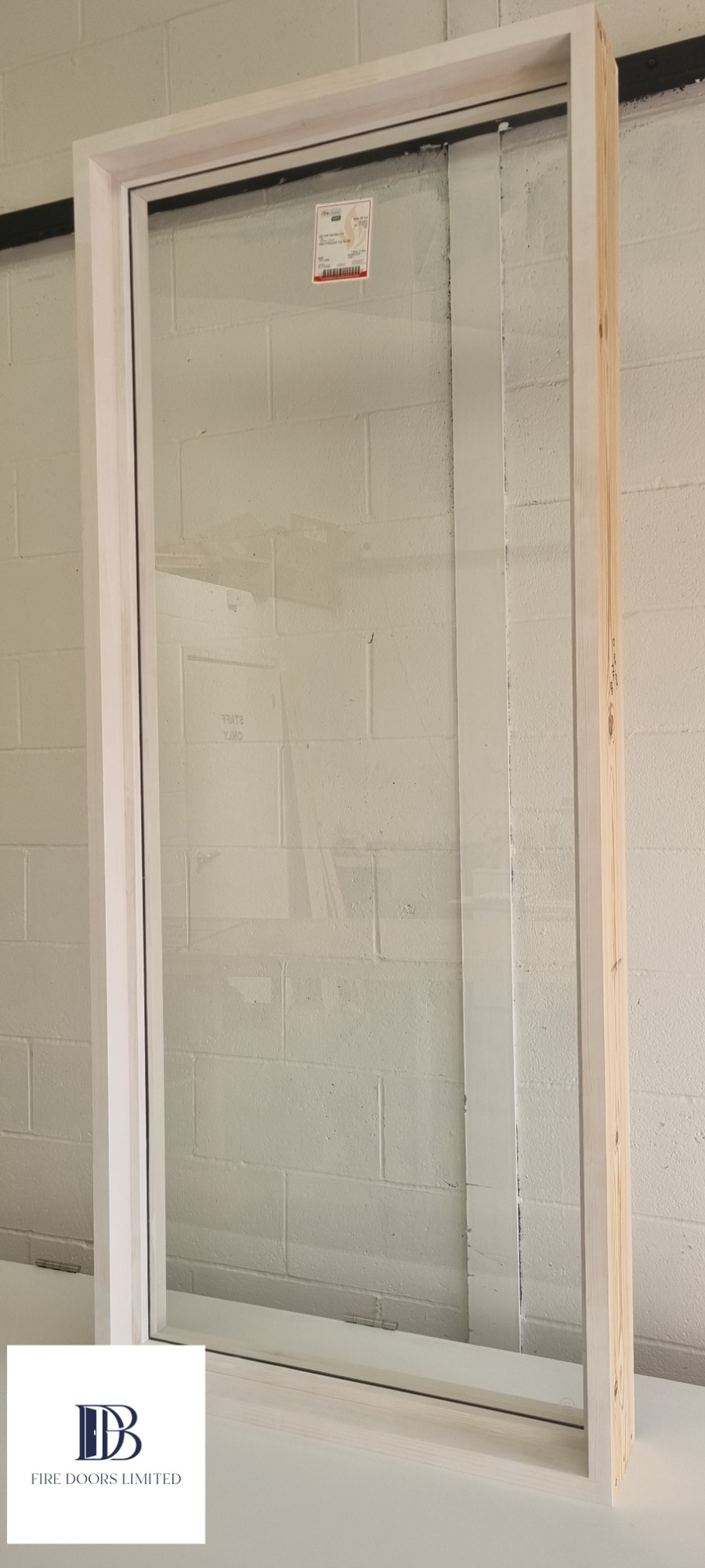 Full-height primed timber paint grade fire-rated sidelight or screen with large clear fire glass, ready for custom painting.