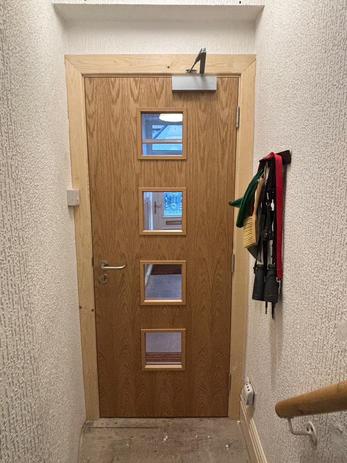 A fitted narrow oak door complete with compliant fire signage and a heavy-duty overhead door closer.