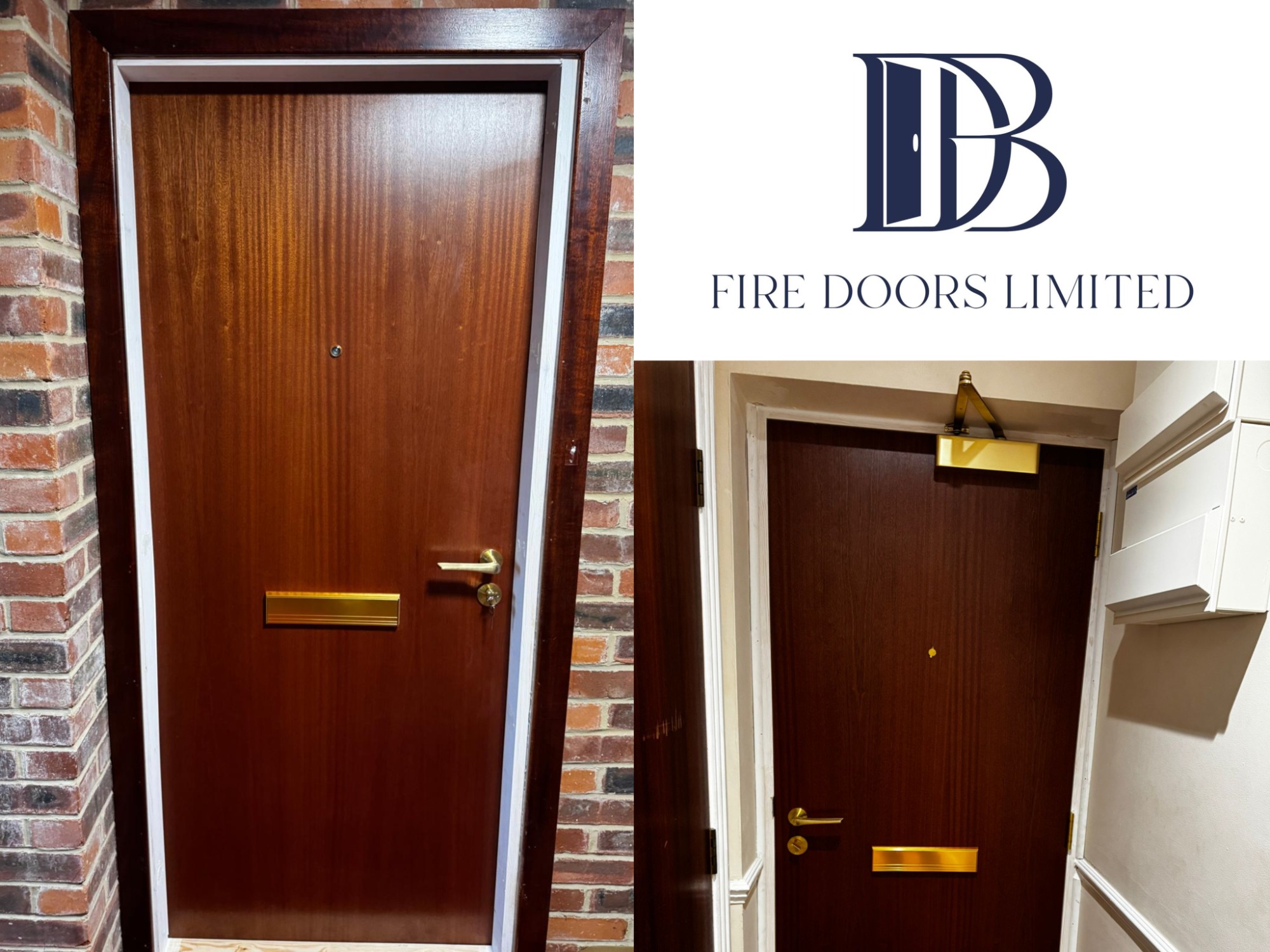 Premium Sapele veneer fire door with a professional ribbon grain. Includes high-quality brass handle, letterbox, and viewer.