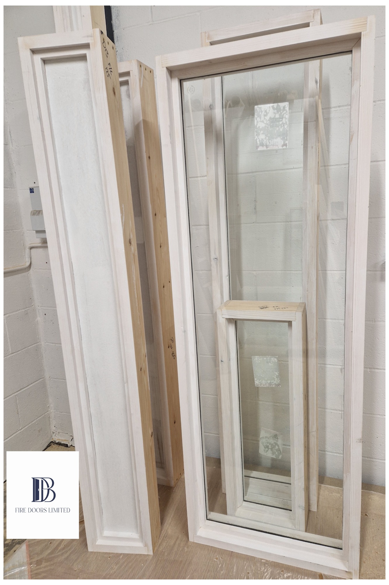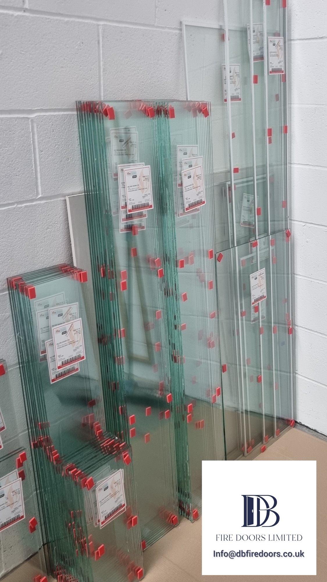 Stacks of certified fire-rated glass sheets with labels, stored in the warehouse for bespoke fire doors, fanlights and screen glazing.